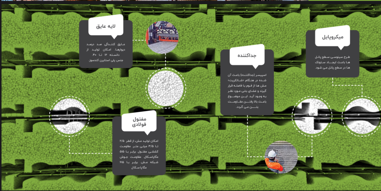 این پنل متشکل از دو لایه پلی استایرن بوده که هر لایه دارای دو صفحه مش فولادی در طرفین میباشد . این دو لایه با تعدادی کانکتور به هم متصل شدند.تا دیوار عملکردی یکپارچه داشته باشد پس از نصب ،فاصله ی دو پانل با بتن پر شده تا نقش باربری را ایفا نماید .